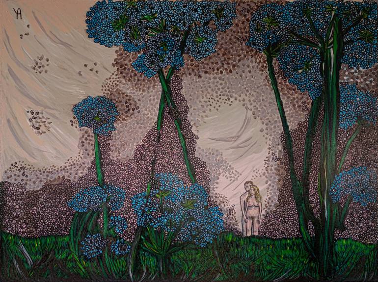 In this painting, Yoti evokes shared steps into a new life, with a clear allusion to the Garden of Eden. At its center are two figures standing close together, their nudity symbolizing vulnerability, purity and the raw essence of human connection. Their intimate pose suggests a shared journey, a ste...