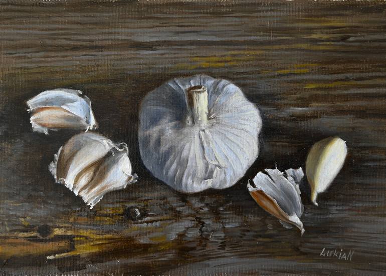 A small painting in the hyperrealism style - a still life depicting garlic lying on a wooden table. Please be attentive! This painting requires time for obtaining an export permit from Montenegro. If you are willing to wait, I will send you the painting within 30 days.