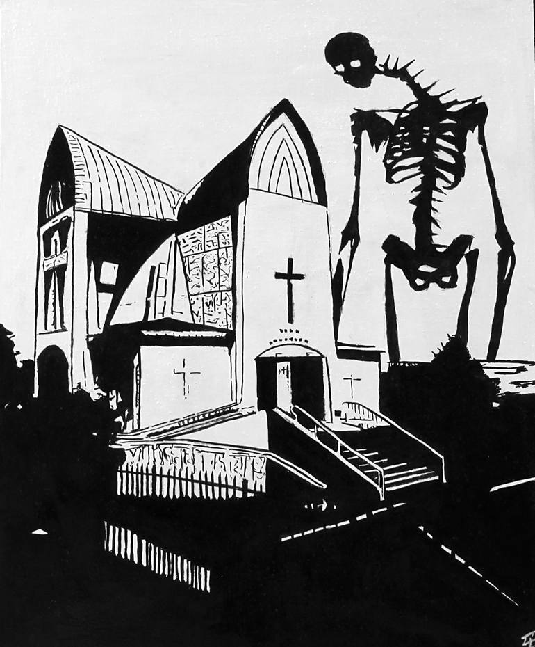 Gashadokuro in St.John's Church Oil & ink on marble dust. Black cotton. 50x40 cm, Federico Galeotti, 2020.