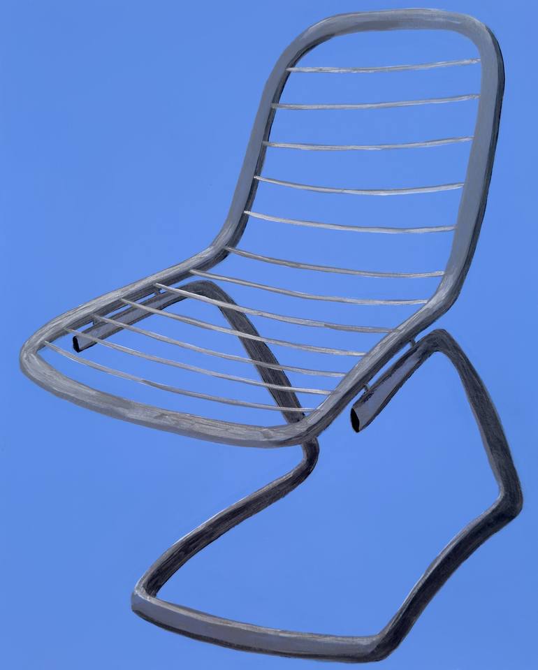 2024, flashe and acrylic on paper, 20 x 16, unframed. This is a still-life painting of a modern silver chair designed by Gastone Rinaldi. I used a special silver acrylic paint that can only be appreciated in person. Signed, dated, and titled on the back.