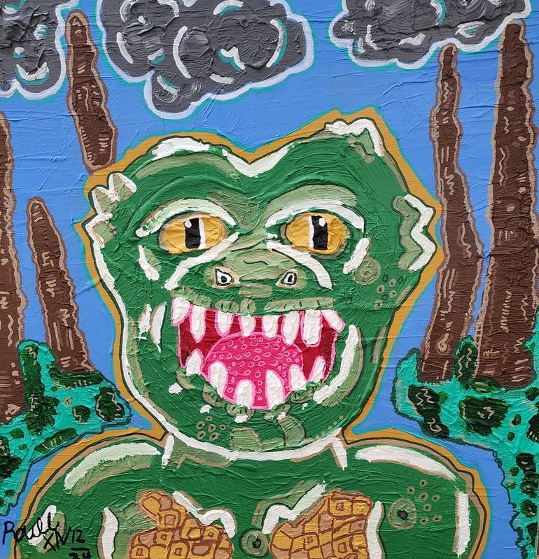 This painting is inspired by the monster from the creature from the black lagoon, which was called Gillman. This painting takes place in a Louisiana swamp. It is an urban legend which actually exist. In this dimension.