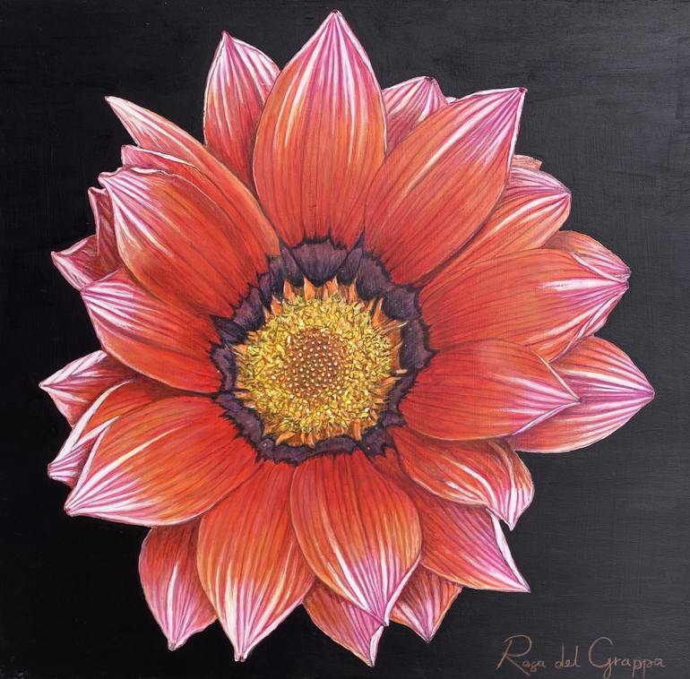 An explosion of color and life, this piece captures the beauty of nature with bold, vibrant tones and intricate details. Painted on a 40x41 wooden panel, this work brings the delicate yet powerful flower into a new light, inviting the viewer to explore its depth and texture. The Gazania flower, with...