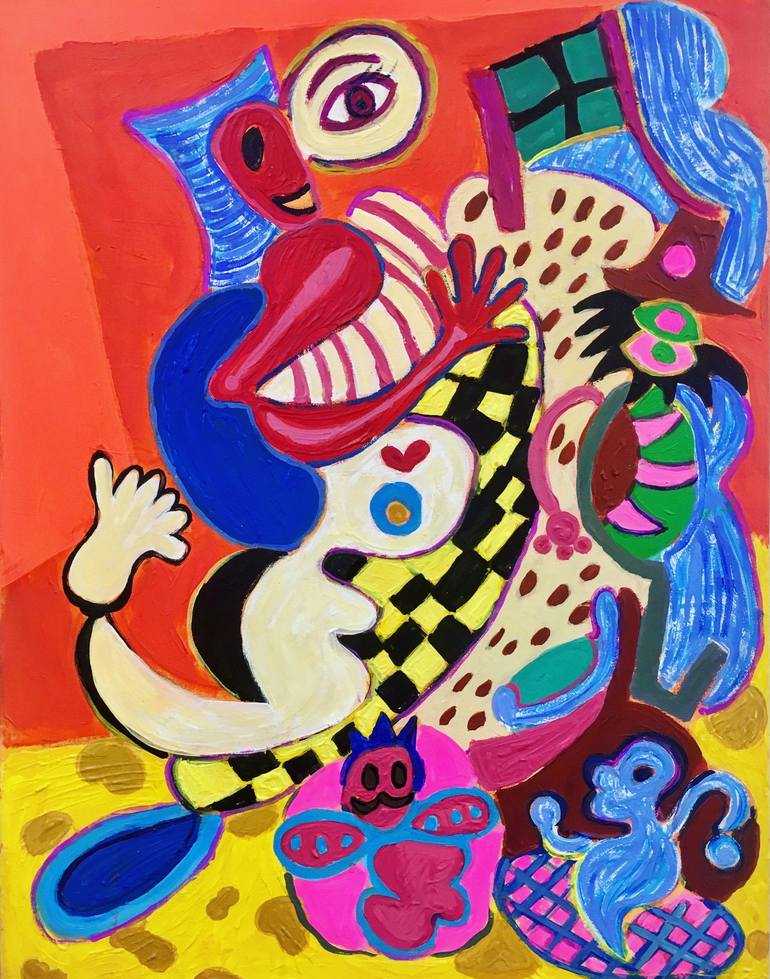 I employ bright colors and shapes with acrylics that immediately grab the eye. My work is a bold and memorable display with colors used in signage to noticeably capture an otherwise forgotten moment. The loud colors represent femininity, courage and strength in a modern world. Perhaps related to not wanting to let go of a memory and the desire to be remembered. I am inspired by the vibrant colors and patterns of folk art and crafts. Although color takes precedence in these paintings. Shape interaction and patterns play an important role. They are like rhymes that harmoniously flow through my compositions. My images are dreamy fantasies transforming the subconscious to another place I also think about the autonomous drawings of the surrealist or drawing without conscious thought. Regardless of the common domestic plots there is nothing completely ordinary in my world of painting. They bravely incorporate a carefree style. One moment of creation may not necessarily be safely carried to the next painting. My work has a range of figures, symbols, patterns that switch from recognizable to abstraction. This arrangement exudes a surreal dreamlike quality. The paintings weave in and out of my dreams. They dive into the mind and bounce out to bold world of art. Fantasy transforming into materiality. Ultimately I like to think of how my artwork and femininity takes place in the modern world. I channel memories, ancient wisdom and dreams of women from the past. My patterns and electric colors with dynamic shape interaction bring a new femininity, boldness and bravery, as we face the uncertain future.