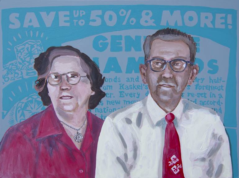 This artwork is an acrylic painting on a wooden panel. The couple is based on a vintage found photo and the background is based on an old advertisement.