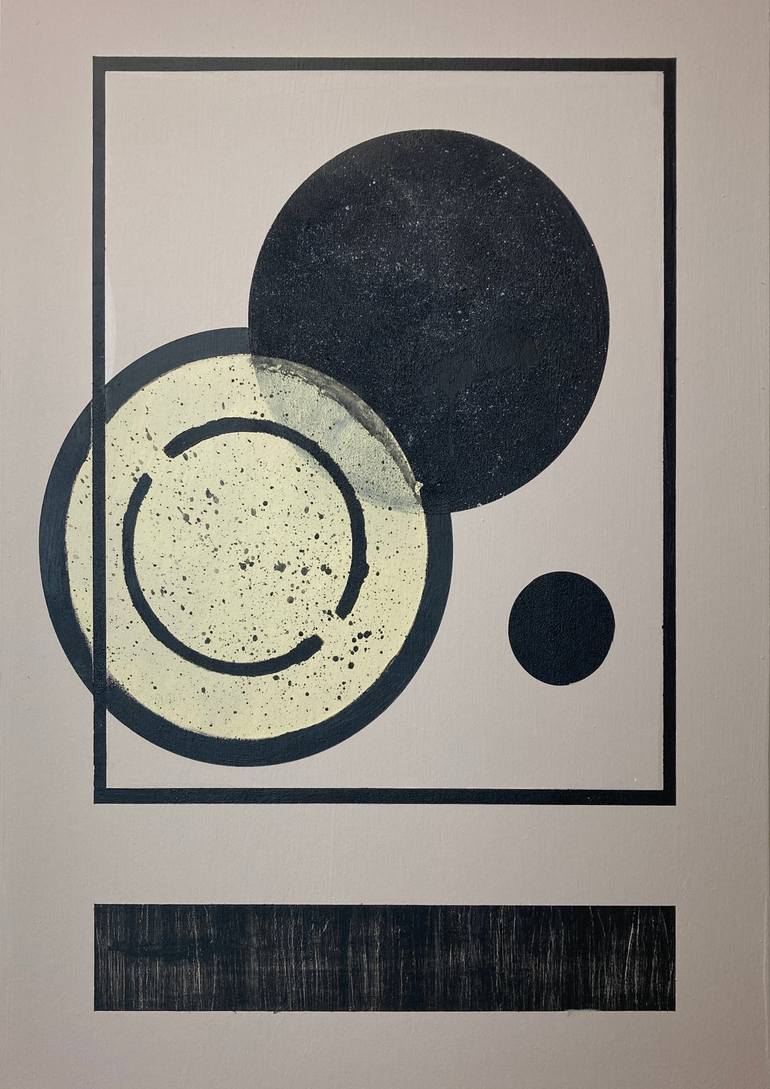 "Geometria y Texturas 6" explores the harmony between structure and fluidity, using overlapping circular forms within a bold rectangular frame to evoke a sense of cosmic alignment. Created with acrylic on a wood panel, this piece features textured greys and blacks that add depth and intrigue to its ...