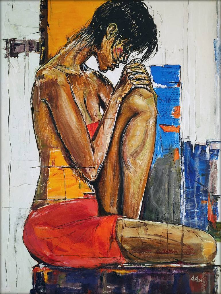 Get a Grip presents an evocative study of human introspection, capturing a woman seated with her arms wrapped around her knees, her body language intimate and closed. The contrast between her rich, earthy skin tones and the vibrant colors surrounding her—intense blues, warm oranges, and fiery reds—h...