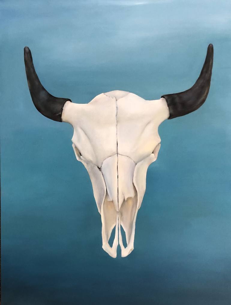 This painting started as a traditional landscape, but I was stuck and decided it might look cool with a skull over it! Painted that, but the landscape was still there needing work, so I painted the whole thing turquoise, and love it! This painting is on gallery wrapped canvas and the edges are pain...