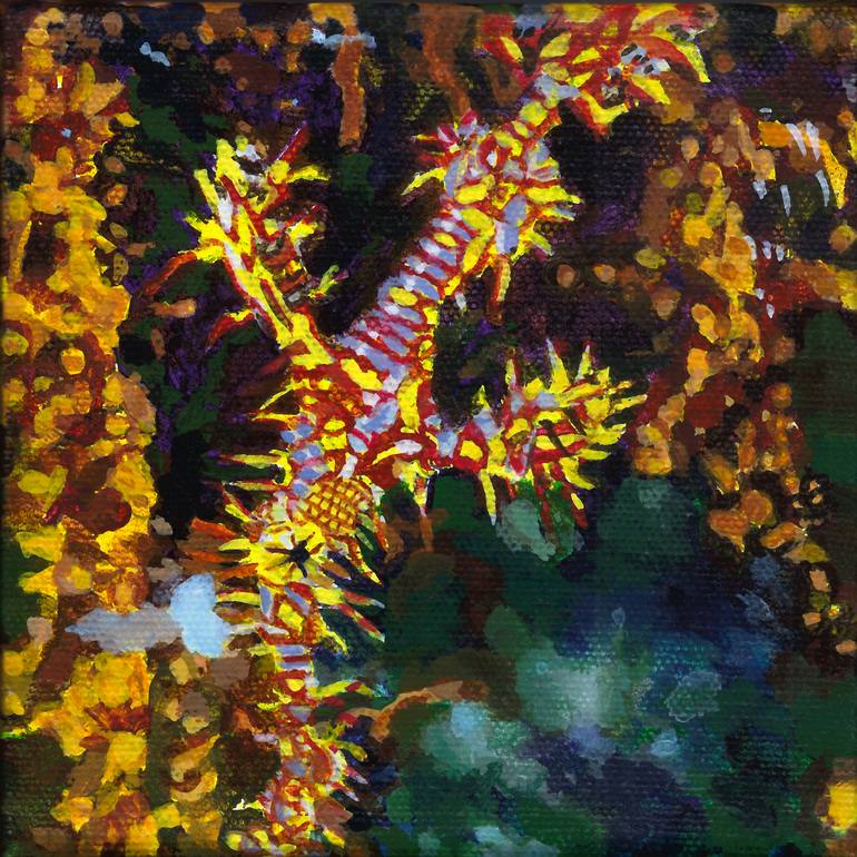 Acrylic on canvas. This painting is part of the Camouflage Fish Series which considers the visual complexity of camouflage, a necessary characteristic for survival that conceals animals within their environment. Framed dimensions are 7.25 x 7.25 x 2.25 inches.