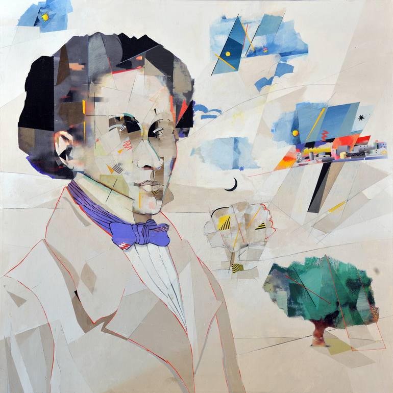 Portrait of the greatest Italian poet of the nineteenth century for the lyrical quality of his poetry, reflecting about the existence and the human condition. In this artwork some elements are executed in collage: fragments of paper that I have decorated and cropped, and embedded in acrylic medium.
