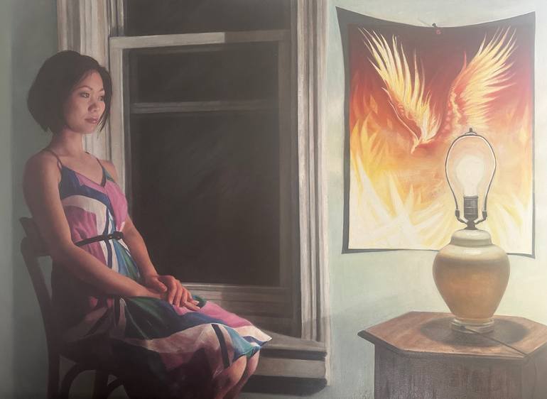 This is a large and detailed painting done from life, of a girl staring at a light bulb. It was many hours of rendering, meticulously painted in oil paint. She is wearing a beautiful dress. This is 3 paintings in one; the girl, the light/still life, and the window/interior itself.