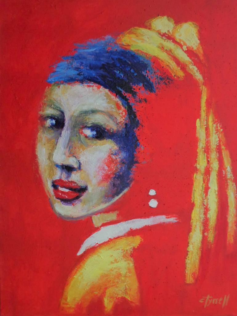 Portrait of a sensual young woman, inspired by Vermeer's painting "Girl With A Pearl Ear Ring". Textured and colourful using red, orange and blue colours. Certificate of Authenticity. Deliver professionally wrapped and packed in a cardboard box.