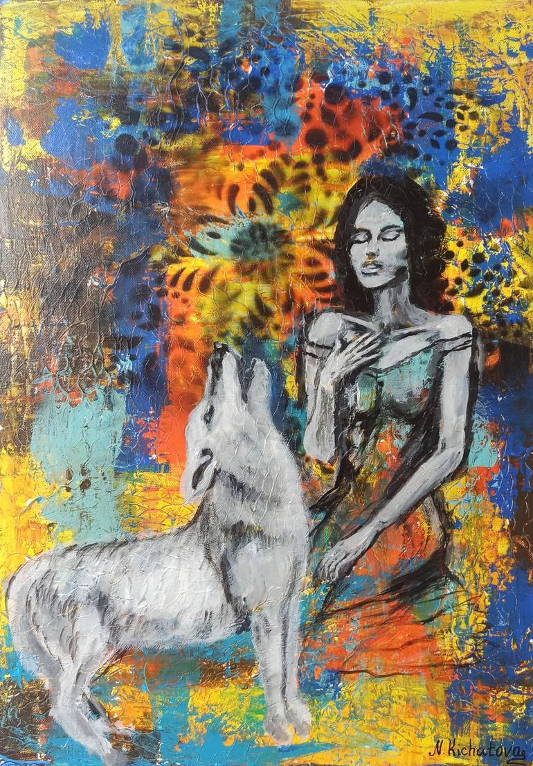 Girl and Wolf” – a visual story of quiet strength and untamed spirit. Acrylic on canvas, 40 x 60 cm Concept / Idea: This painting explores the mystical bond between a young woman and a wild wolf — a symbol of intuition, primal strength, and inner wilderness. It tells a story of trust, silent unde...