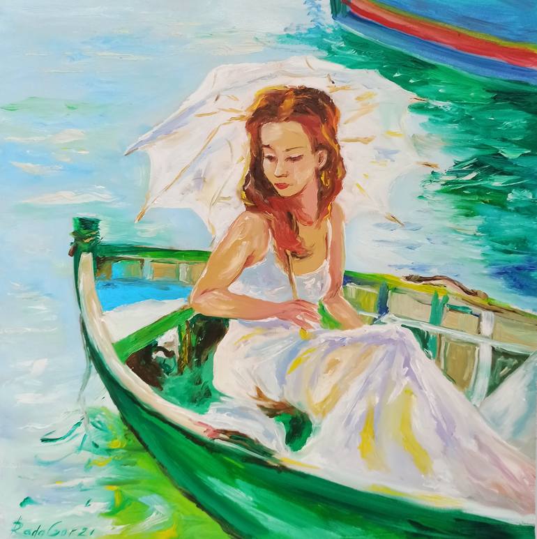 The painting is painted in oil on hardboard. This is a classic story of a girl in white with a beautiful umbrella. Lake and green boats. beautiful landscape with a beautiful lady. What is she thinking about, who is she there with? All these questions arise when looking at the painting. I like it w...