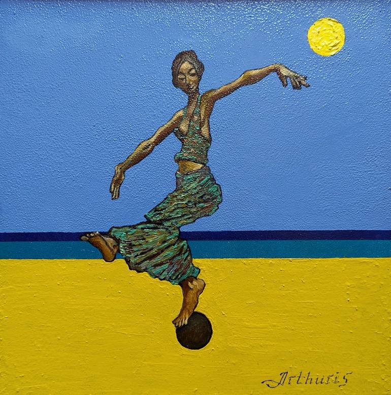 "Girl on a Ball. "Mermaid (I)" Painting in the Naive style with a floating frame Oil, canvas, panel, frame Dimensions: 32 x 32 cm The painting is ready for use, does not require any additional costs and can be hung on the wall immediately after purchase.