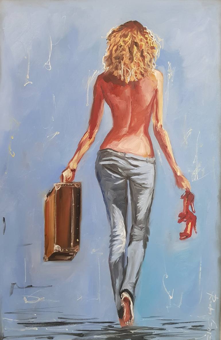 Girl with Bare Back Girl in the Rain with a Suitcase Sexy Girl Nude Painting Red Shoes Oil Painting Figurative Painting 19.5x13 Very candid painting with a semi nude girl. She goes barefoot and topless, with a vintage suitcase, jeans and red sandals in her hand. Where is she coming from, what is sh...
