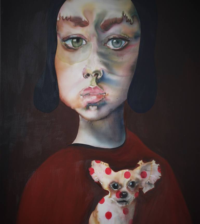 An acrylic and watercolor contemporary portrait with little dog. As it is known from history an "ideal beauty" is an entity, that is admired, or possesses features widely attributed to beauty in a particular culture. In my new series “Beautiful and Ugly” I am researching the beauty as a phenomenon i...