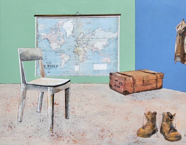 Painted with acrylic on a linen canvas. Stretched on a wooden frame. Also painted on the sides and ready to hang. “Give the traveler a chair” is painted with acrylic on a stretched canvas of 80x60cm. Pereboom uses the metaphor of a chair for hospitality, the suitcase for coming home with stories,...