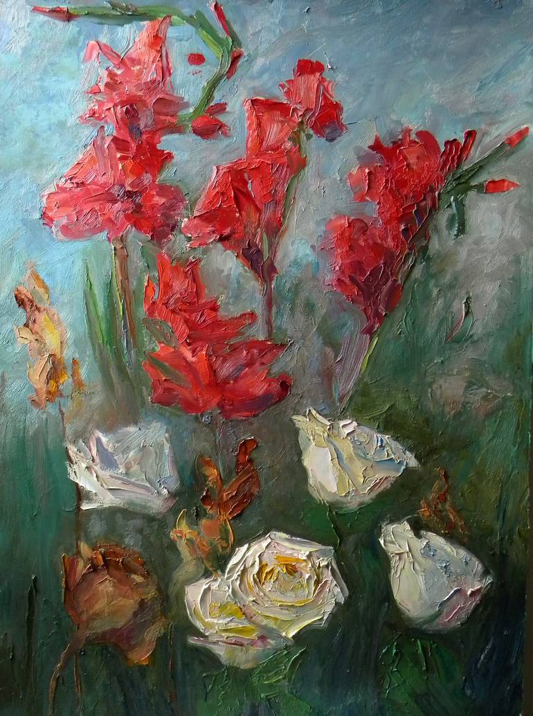This was painted from life. I arranged gladiolus, roses, dried roses, dried leaves and fresh leaves to create a balance of color, life and death. The painting was done on pastel paper mounted on wood panel and is ready to hang, framed or unframed.