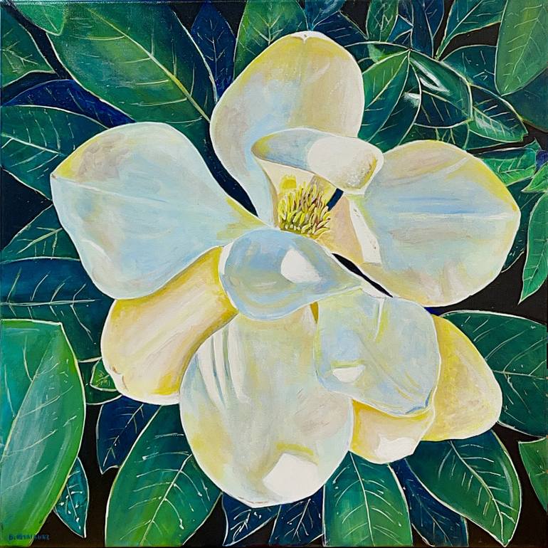 Gleaming Magnolias captures the simple elegance of magnolia blooms on a square canvas. The soft white petals glow against lush green leaves, bringing a calm, natural vibe. Perfect for adding a touch of serenity to any space.