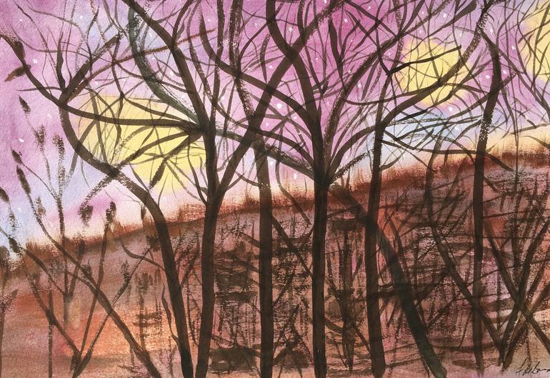 I hope the viewers feel the magic of the stars glittering in the night in a winter woodland. It's both a solitary and warm painting. The harmony of colors evoke the stillness of the night and the illumination of the sky. Two contrasts which express our daily life, both natural and emotional.