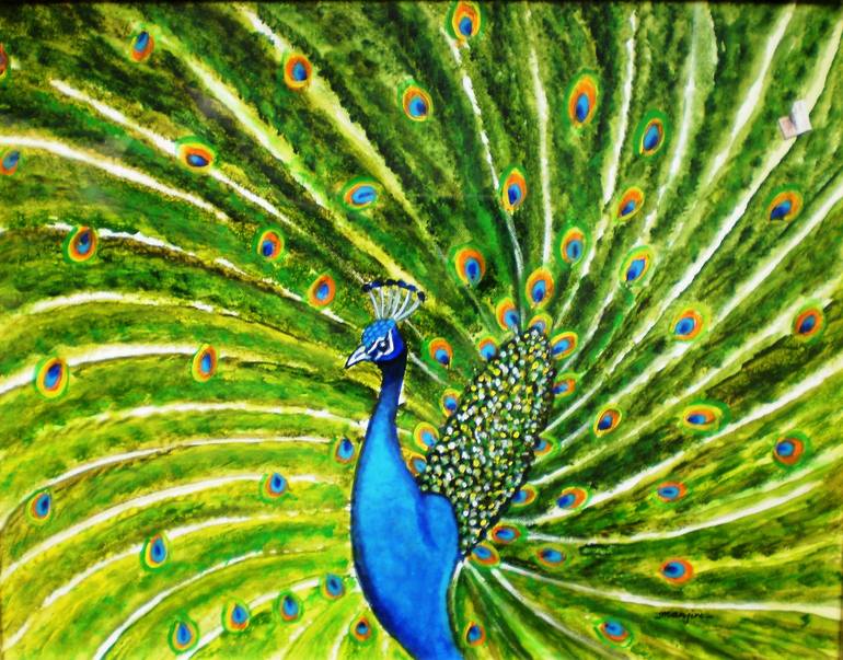 This painting is a definite 'WOW'! In 'Glorious Peacock' I have tried to capture the beauty of this beautiful bird. In Asia, the feathers of the peacock are considered auspicious and protective. In both the Hindu and the Buddhist traditions, the peacock's influence is mainly in the realm of worldl...