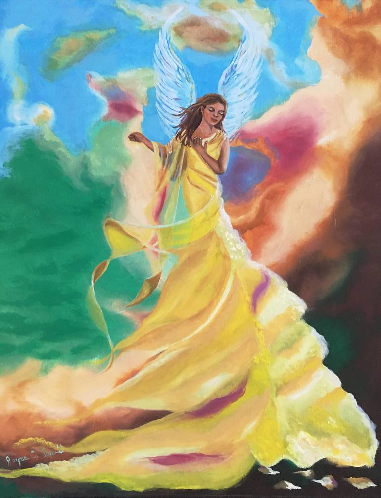 My paintings are usually metaphorical and representational. I use color to express feeling. I often use the universal theme of "The Mother", referring to the loving, nurturing Divine Feminine. The backround was inspired by a Hubble photograph. I love angels, who I see as representing the Divine, un...