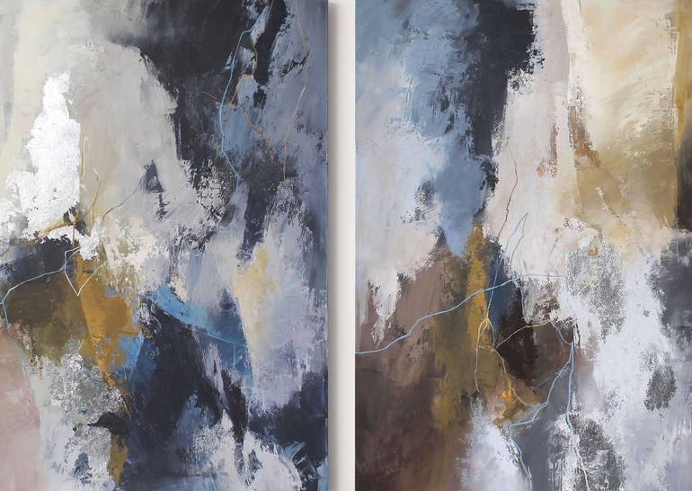 This original acrylic painting, "Glory set", invites you to explore the subtle side of abstract art. Navy, gray, and silver tones blend harmoniously on the canvas, creating a modern and contemporary piece that will add sophistication to any space. The application of silver leaf adds a touch of under...