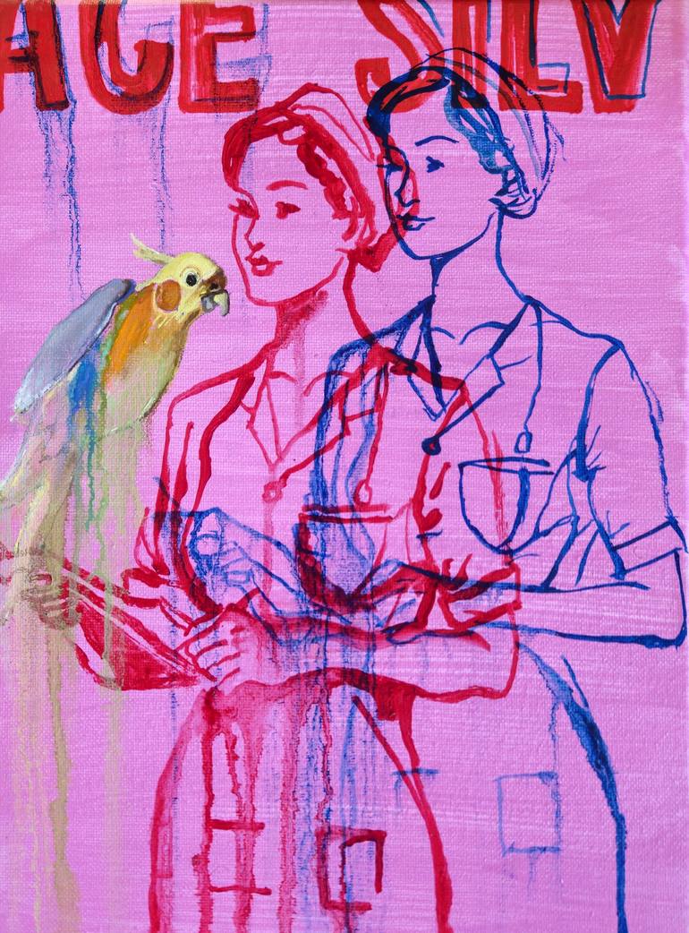 Juxtaposition between the animal and human as well the presence of language and its relationship to apprehending meaning from it. A vibrant bird, the red and blue nurse and words.The word fragments Ace Silv share the pink space while being independent and autonomous and thwarting a figure ground rel...