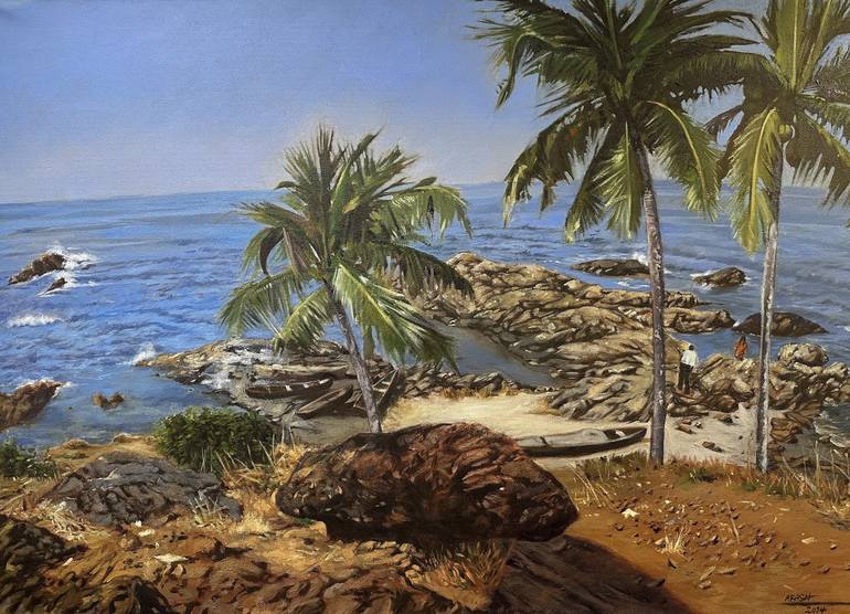 This painting captures a serene coastal landscape, where rugged rocks meet the vast expanse of the ocean, framed by lush palm trees swaying in the breeze. Inspired by the beauty of tropical shorelines, this piece reflects the tranquility and timeless charm of nature’s coastal wonders. The detailed b...