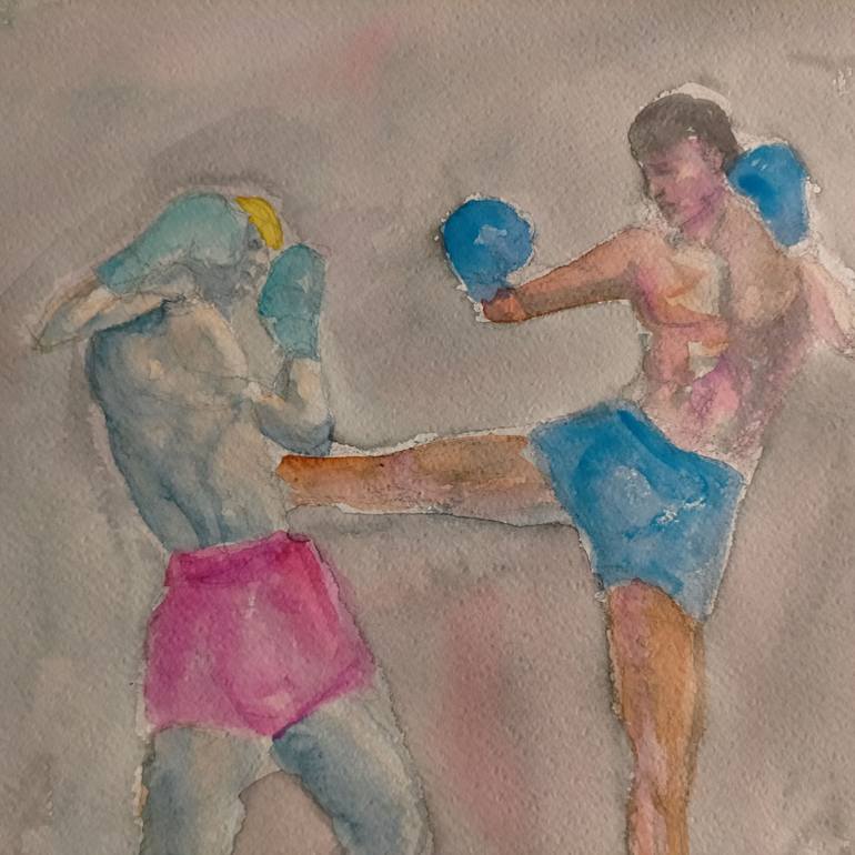 As a practitioner of Muay Thai I am very interested in the topic of martial arts. The body in movement is extremely beautiful. The use of watercolour allows a nearly abstract kind of painting and creates colourful harmonies which establish a communication between the viewer and the artwork.