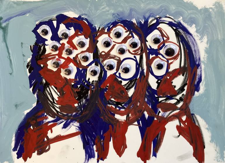 Acrylic, markers and goggly eyes mounted to Matt board.