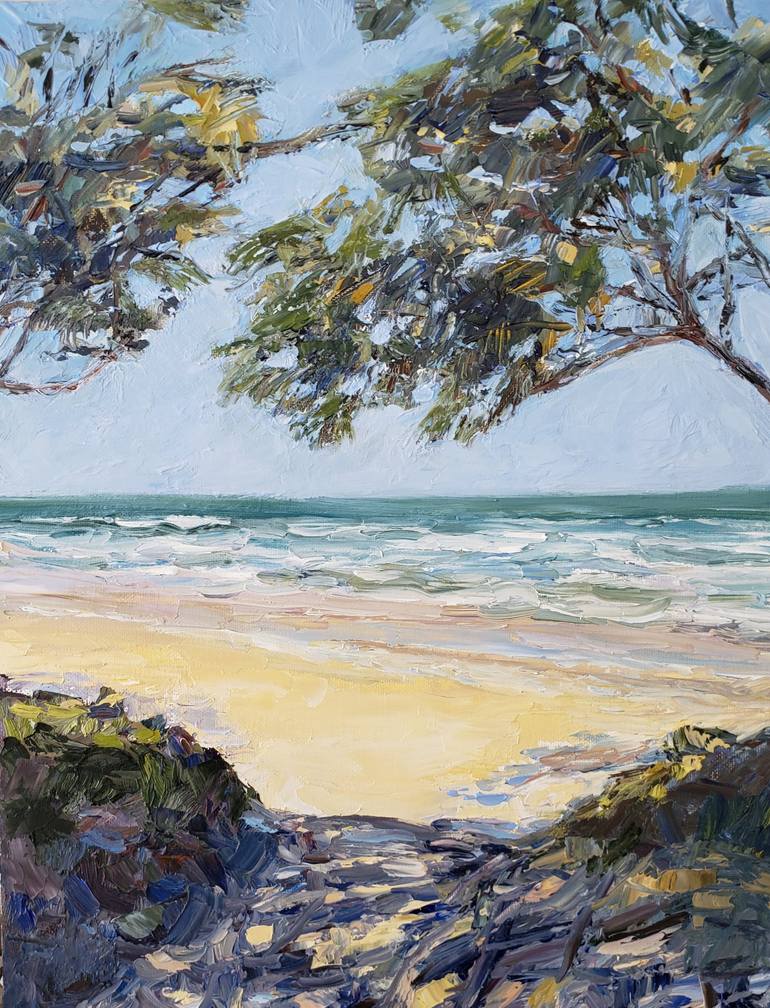 The Australian Painter Dan Scott inspired this Impressionistic seascape. I love the warm sand contrast to the cool tree shadows. I mostly work off of photographs and he had provided some of his beautiful homeland for other artists to use. In all my landscape paintings I try to imagine I am there wh...