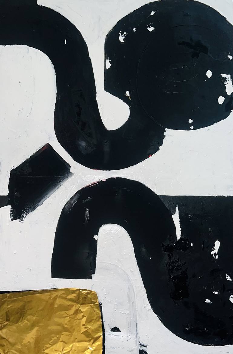 “Disrupted Flow” is a bold abstract composition that explores the tension between structure and spontaneity. Thick black forms snake across a textured white field, creating a sense of both movement and resistance. The layered brushstrokes and scattered imperfections invite the viewer to consider the...