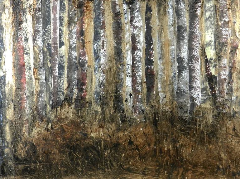 The trees in this forest are strips of Xuan paper painted with Indian ink and then mounted on canvas. The whole is melted into a texture of wax and gold oil paint. The brush scratches suggest the vibration of nature teeming.