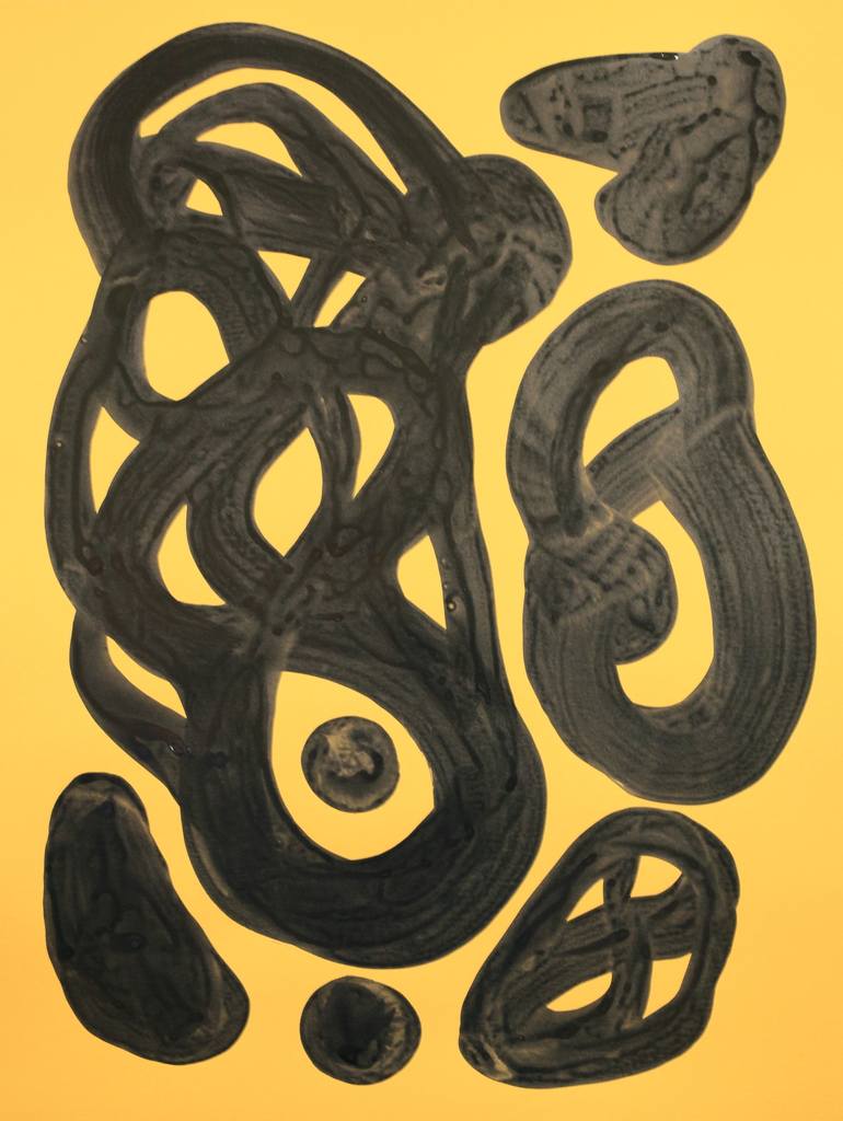 Organic shapes rendered with ink and brush on gold paper. I employ patterns in mixed medial that draw on my fascination with plant and animal forms and symbiosis.