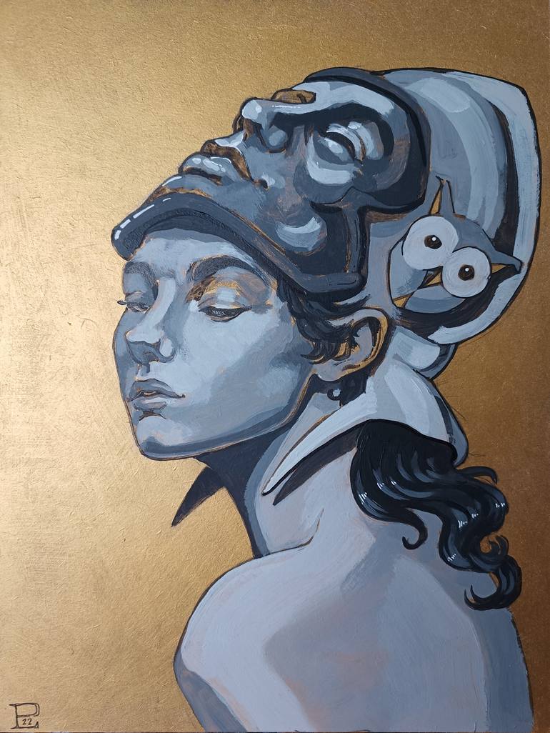 A golden Athena, protector of the arts looking over her shoulder from golden light on her back