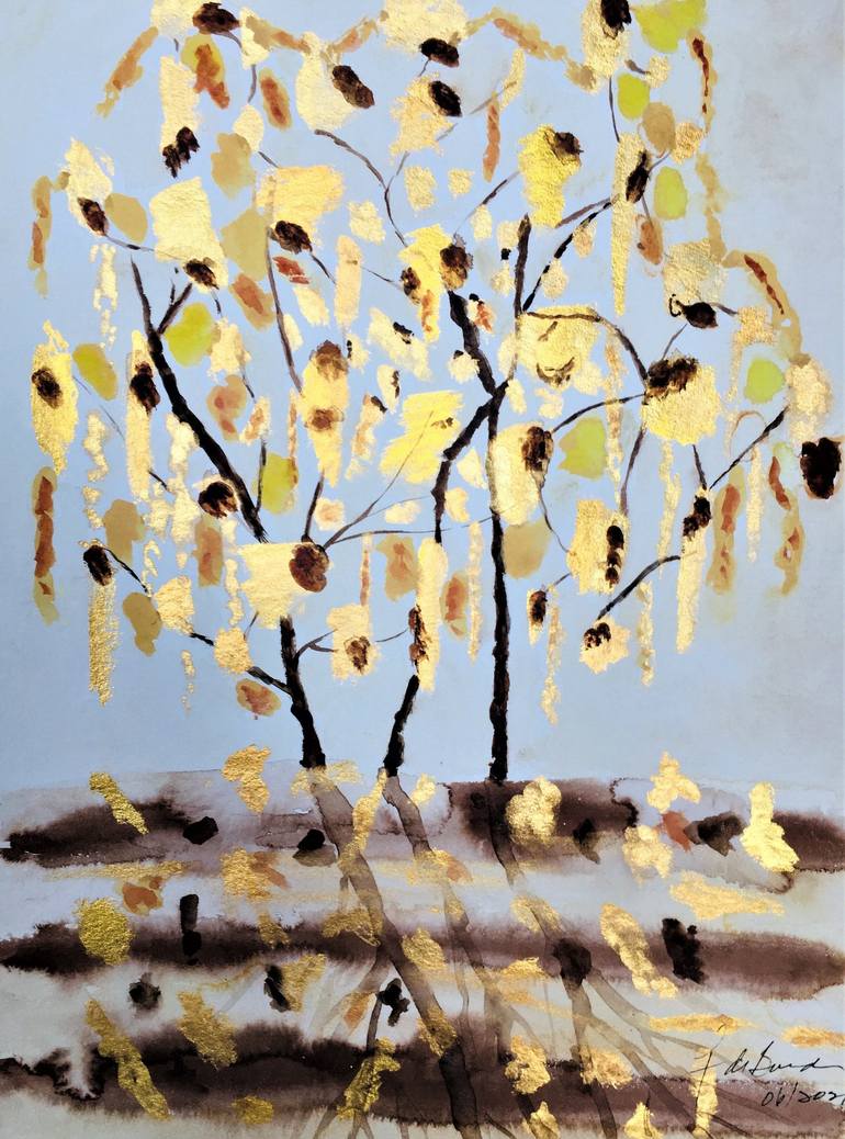 The autumn colors reflect the subtle and vibrant orange, gold and yellow hues. The gold paint highlights the sun's rays and brings magic to autumn.
