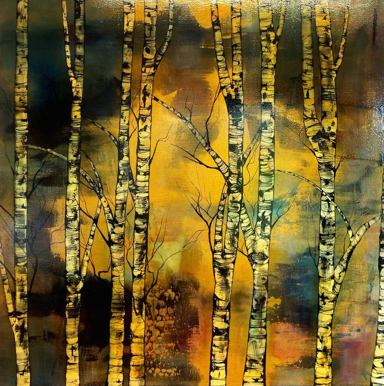 Beautiful Silver Birch trees, set over a semi-abstract acrylic background, reminiscent of first or last light glowing in gold through the trees. Featuring intricate, flowing details in pen, this canvas is also a celebration of natural beauty, glimpses of light, and earthy colours. Here, Lily has com...