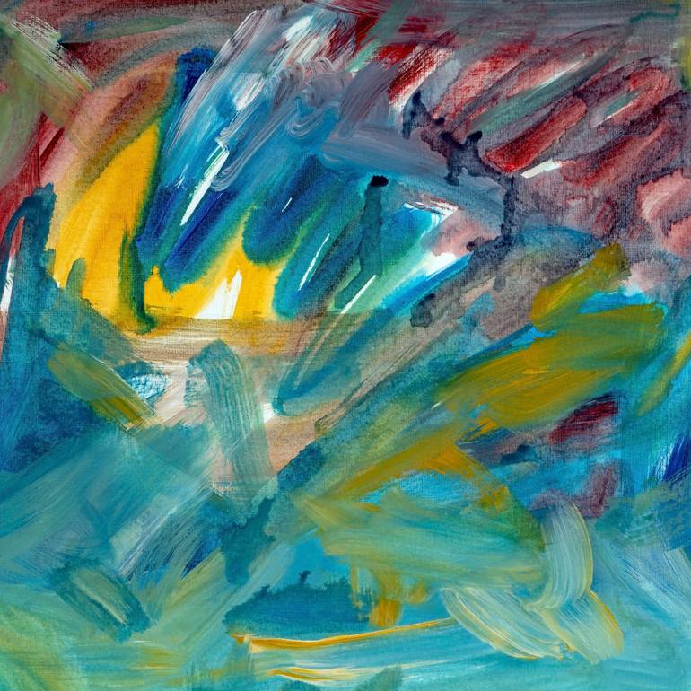 This abstract painting is all about color. The golden yellow glows like the sun rising over the water. Whatever you may see in it, the color is the subject. Look at the center of the yellow area. My muse left a little surprise for both of us. I did not consciously paint the sailboat.