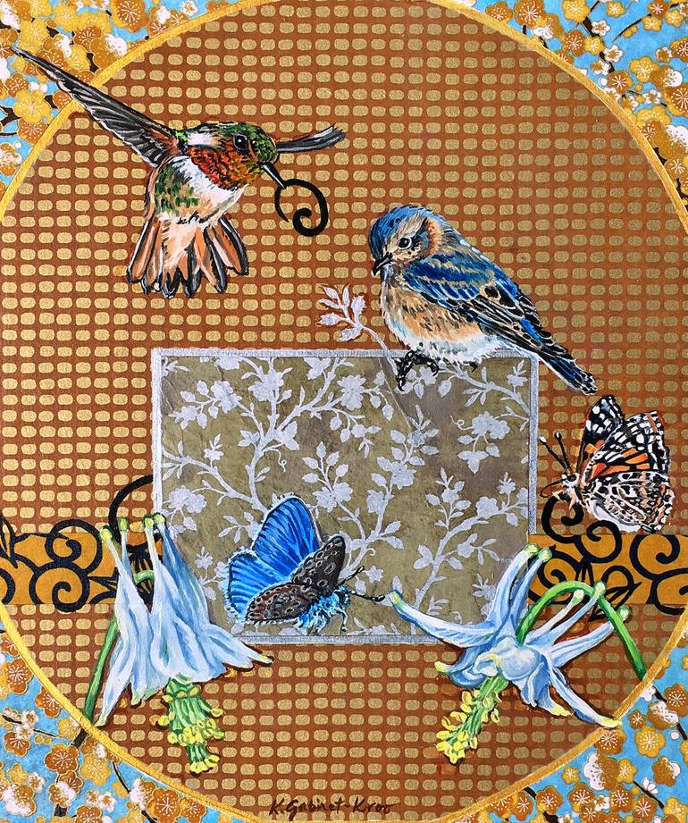 This piece is painted in oil and acrylic on a collage of Japanese chiyogami paper that is mounted on a gessoed wood panel. Realistically painted elements from nature dance against a background of rust, gold and sky blue, evoking summer's sky and warmth.