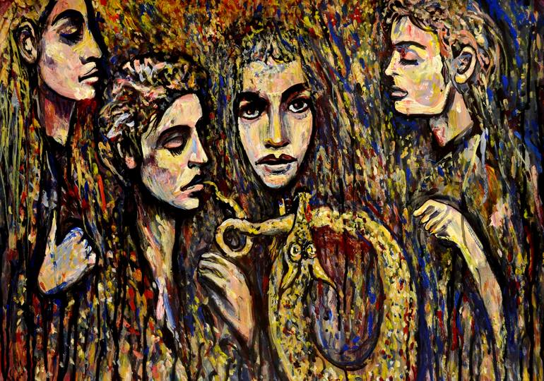 Acrylic painting inspired by alchemy and esoterica. Portrayed four young female models with an 'uroboros' - golden dragon - symbolizes self-reflexivity or cyclicality, especially in the sense of something constantly re-creating itself, the eternal return. Materials: Sennlier acrylic paints and inks...