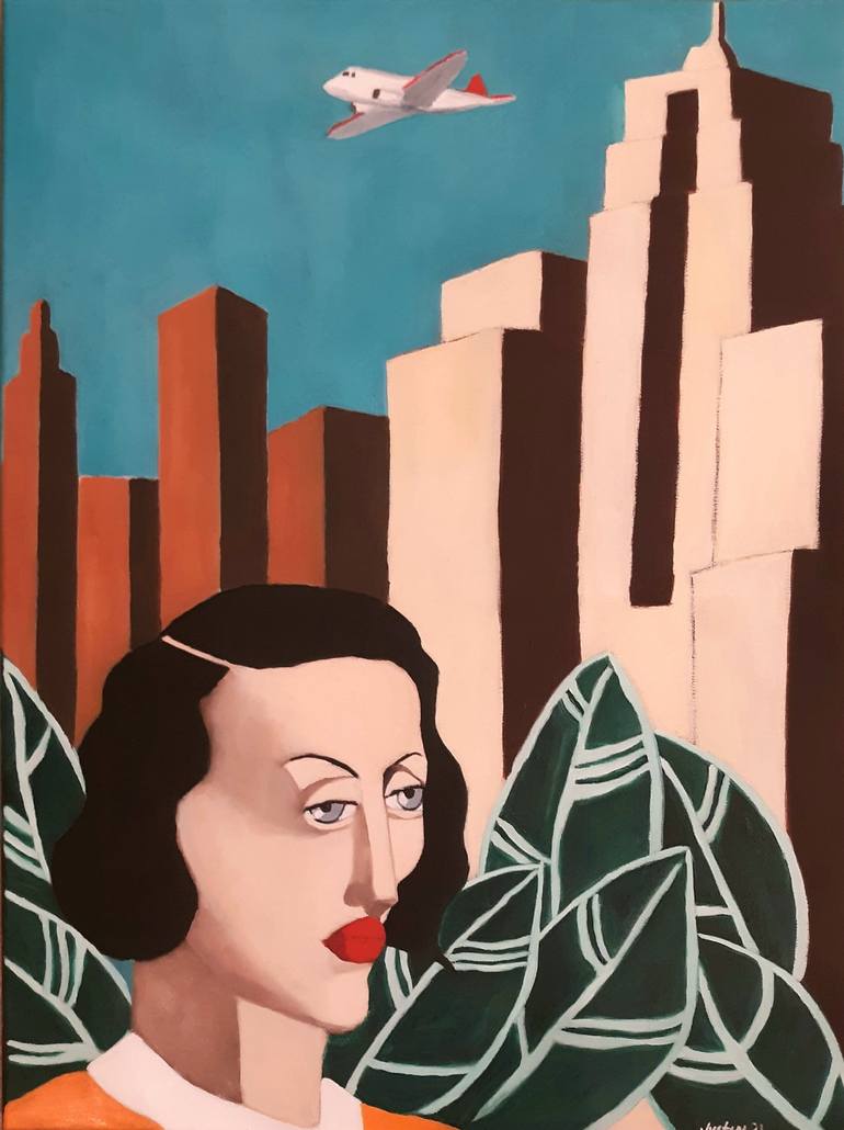 An art deco style painting attempting to pay homage to the artwork of the 1930's. With a woman looking beyond with the cityscape and airplane overhead in the background.