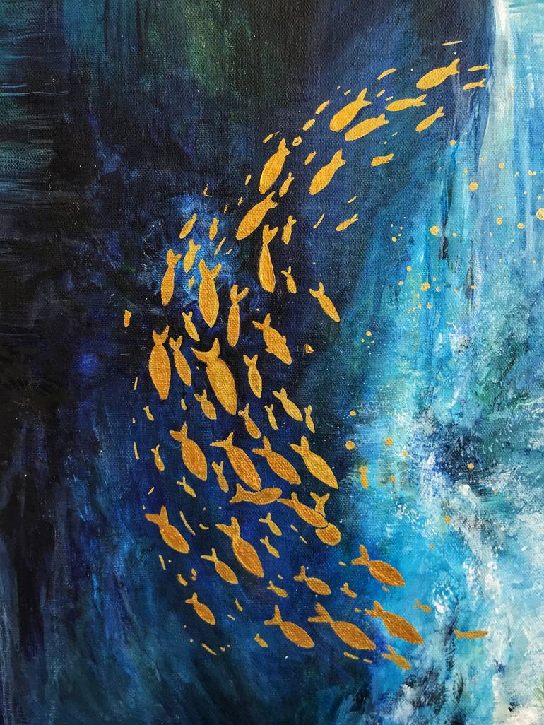 This acrylic painting was inspired by ocean theme, depicting golden fish rushing through blues and greens of water.