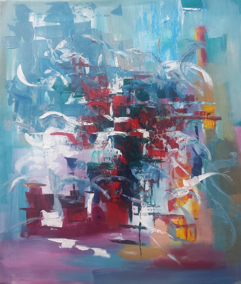 Abstract painting on canvas. Acrylic abstraction on canvas. Abstract red ship in the port. The ship surrounded by white seagulls. Art Decor Large Contemporary Acrylic Painting Beautiful Colorful Modern Abstract