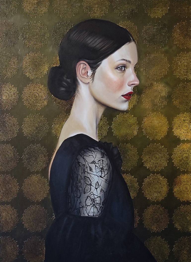 This exquisite classical oil painting features a side profile of a sophisticated woman dressed in black, set against a luxurious ornamental background. The artwork showcases meticulous attention to detail, with a focus on timeless elegance and academic realism. The intricate patterns of the backgrou...