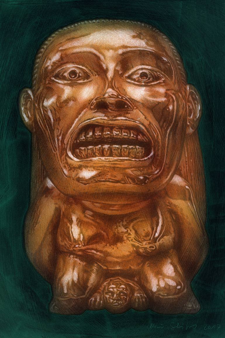 This Fertility Idol of chachapoyan origin was found by Dr. Henry Jones Jr. in 1936 in Peru. Stolen by René Emile Belloq, Jones was able to re-appropriate it later in Marrakesh from antiquities dealer Saad Hassim. It's part of the south american collection at National Museum in Connecticut. I painte...