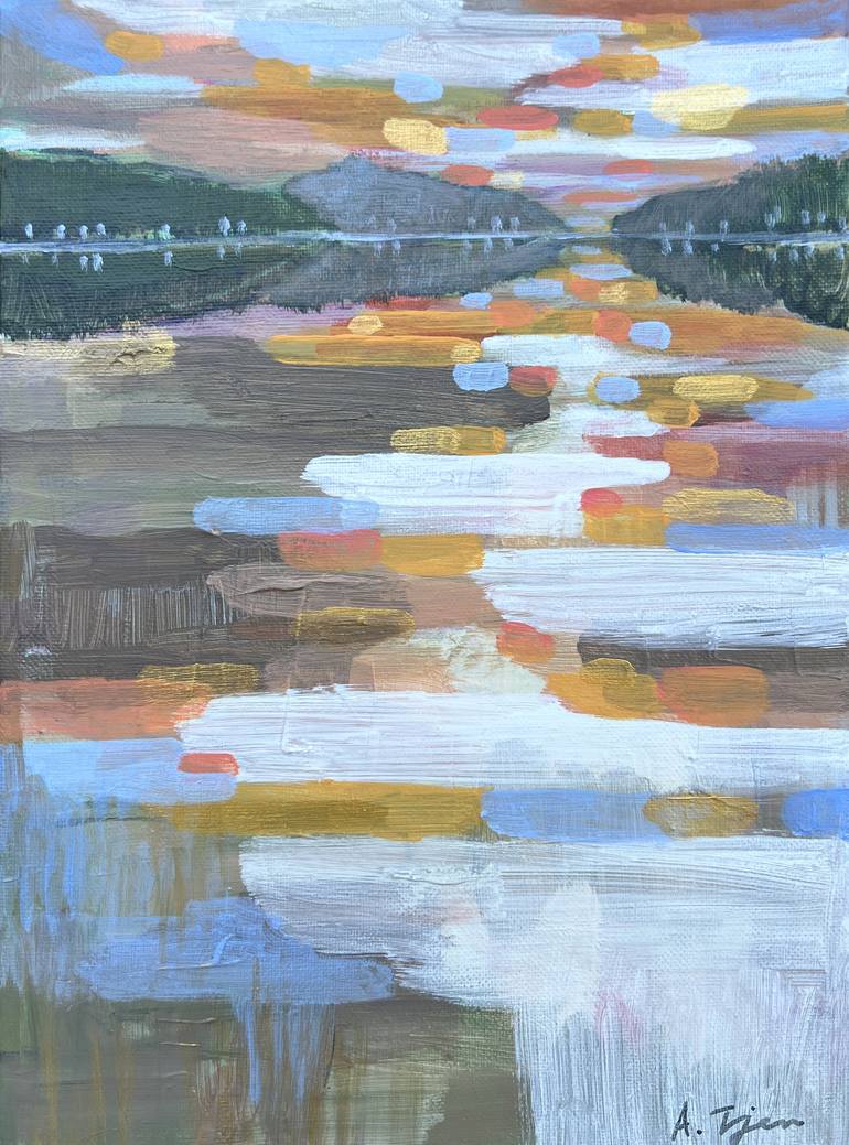 This semi-abstract lakescape is inspired by the colors of summer. The waters of the lake dominate the foreground, creating a sense of depth and perspective. The reflection of the sky on the surface of the water is a juxtaposition of intuitive, loose abstract shapes, capturing the essence of the whim...
