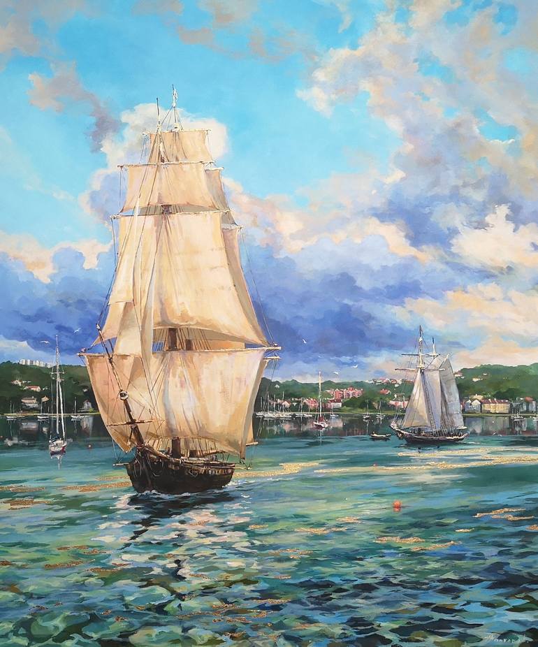 This original painting from the "Golden Light series" beautifully captures the essence of Nova Scotia's shores and ocean views, particularly the stunning Northwest Arm of Halifax Harbour. The incorporation of gold leaf into the acrylic paints adds a magical touch, reflecting the sunlight and creatin...