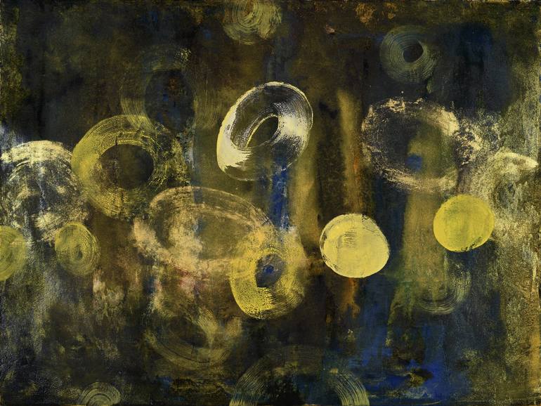 The golden memory river flows in the deep winter night. The symphony of the music of life is sweet and rich. Acrylic green/gold iridescent color brush marks on acid-free, BFK Rives paper with deckled (untrimmed) edge. The size is 22 x 30 inches. Ready to frame.