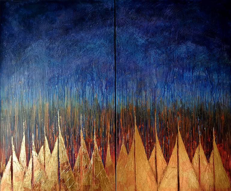 (diptych,each side :150x90cm.) Linen canvas, oil, acrylic,potal,oil pastel. 150/180 sm. 2022. The sea the sea the evening the warm air the contemplation. the old boat. the boats are near. they are resting. gaining strength. the sea the light breeze. Sea Sea and sky. The sky is like the sea. An...